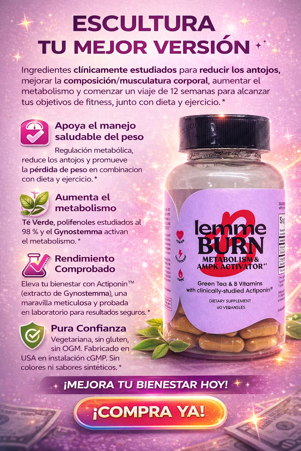 ESCULTURA DE TU MEJOR VERSIÓN: Ingredientes clínicamente estudiados para reducir los antojos, mejorar la composición corporal / masa corporal magra, aumentar el metabolismo y comenzar un viaje de 12 semanas para alcanzar tus objetivos de fitness, junto con dieta y ejercicio. *