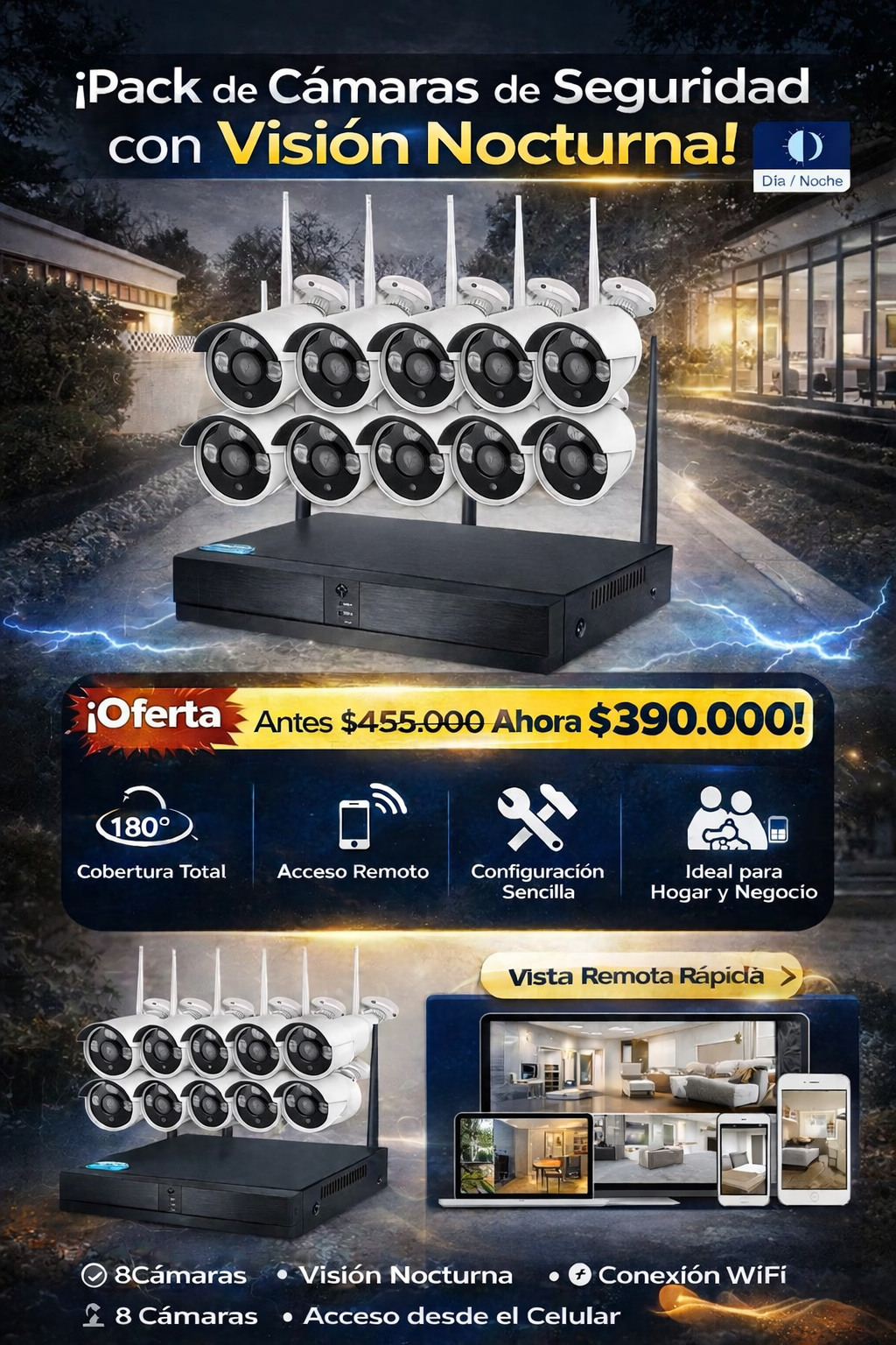 ¡Asegurar la seguridad de tu hogar, oficina o negocio ahora es posible con el Pack de 8 cámaras de seguridad con visión nocturna! Diseñada para girar 180 grados cada cámara, este dispositivo avanzado ha sido creado especialmente para ti. Ideal para restaurantes, cafeterías y diversas aplicaciones, esta cámara también se convierte en tu mejor aliada cuando necesitas supervisar a tus cuidadores de bebés o personas mayores durante todo el día.